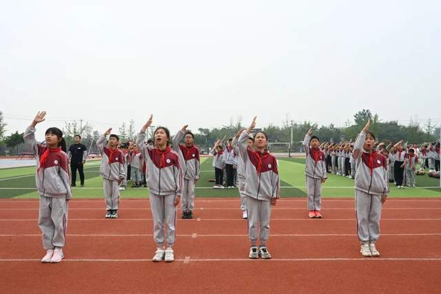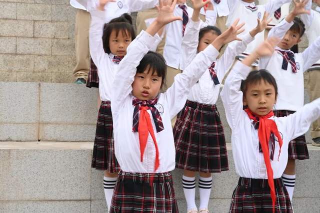 鲜艳的国旗冉冉升起,全体师生行注目礼,少先队员敬队礼,高唱国歌。