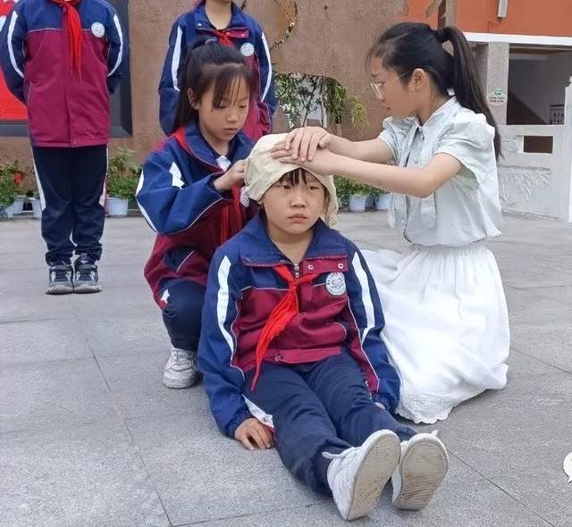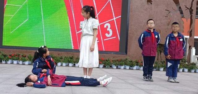 首先是情景剧表演《珍爱生命,防震减灾》,节目中向我们展示了当我们在校园里遇到了突发性地震应该立即双手抱头躲到课桌下面;当同学出现头部受伤、手臂骨折时应当立即用纱布包扎止血、用树枝或木板固定伤口;遇到因哽咽窒息、晕倒的情况如何急救。