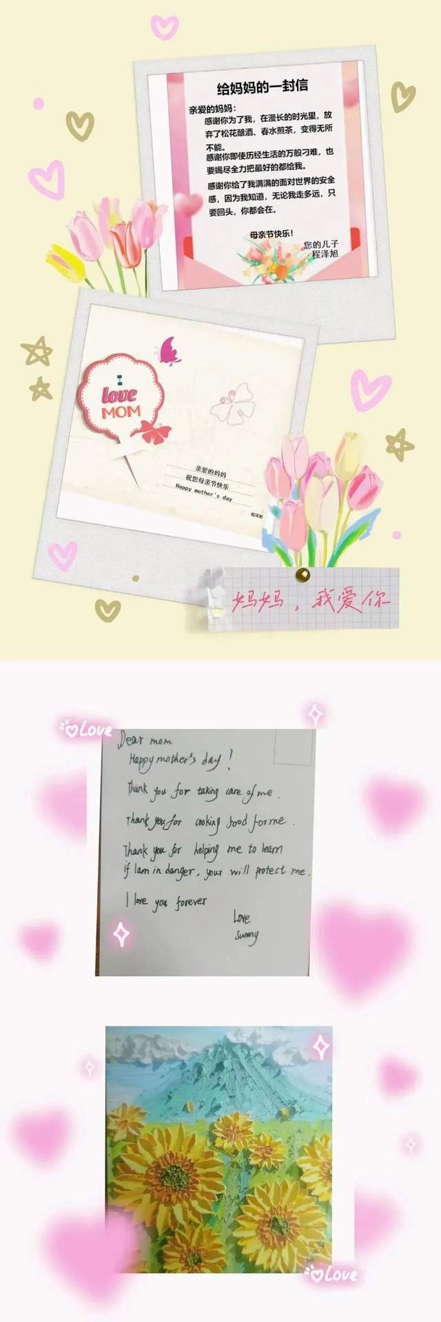 母亲节只是五月中的一天,而妈妈的碎碎念,却温暖了我们的岁岁年年,感恩教育正潜移默化地感染着学生。孩子们决定用实际行动感恩母亲:对妈妈爱的表白;陪妈妈聊天,将自己的学习与生活同妈妈分享;写一封感恩信送给妈妈;DIY一份小礼物向妈妈表达温馨的祝福;为妈妈泡一杯茶,为妈妈捶捶背,陪妈妈散步......