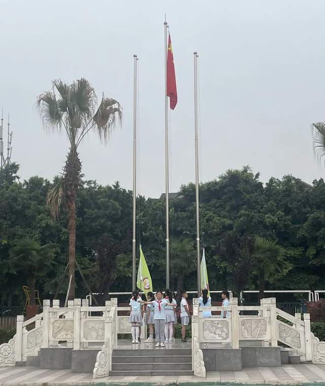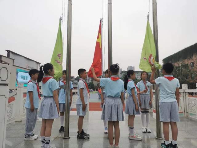 迎着朝阳,英姿飒爽的国旗护卫队迈着铿锵的步伐,护送着鲜艳的五星红旗来到国旗台下。随后国歌奏起,全体同学向国旗敬礼。在振奋人心的国歌声中,国旗冉冉升起,飘扬在校园上空。