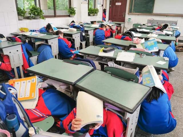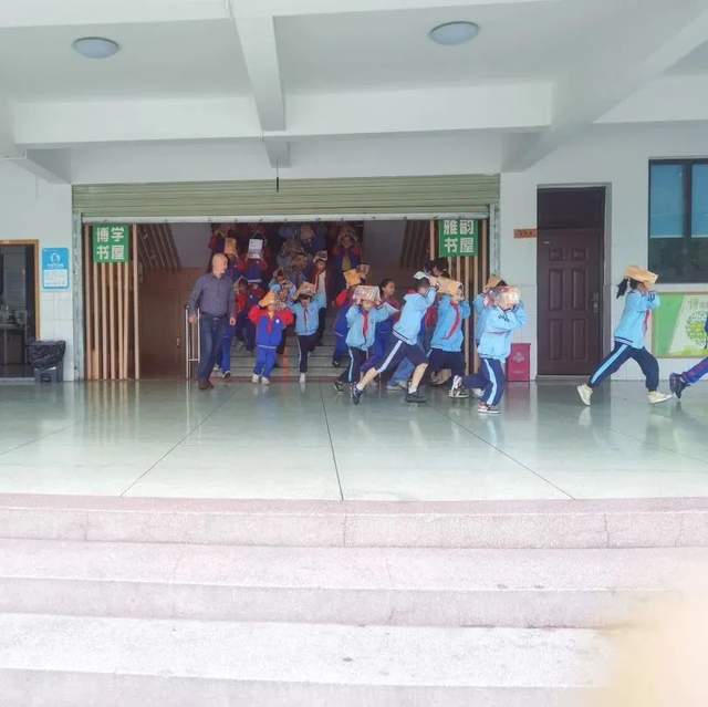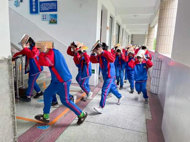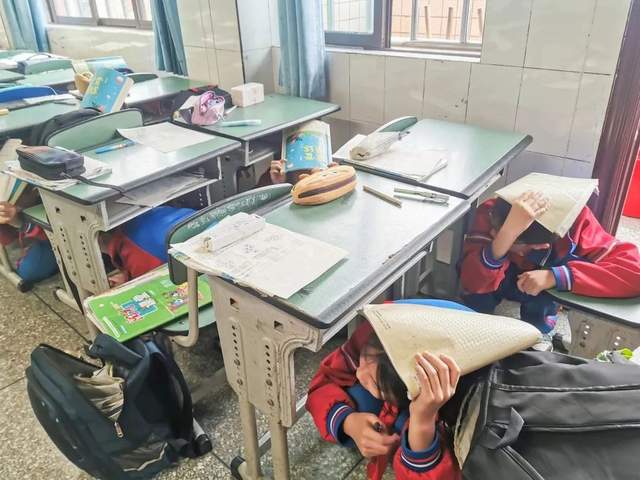 二楼及二楼以上的班级老师听到地震警报信号后,立即组织学生原地避险,引导学生用书包挡头,躲在桌子下或安全三角区域进行紧急避险,尽量弯曲身体,降低身体重心,尽可能保护头部。等待警报声音结束后,再组织学生有序疏散到学校后操场。