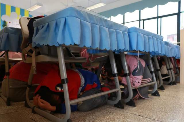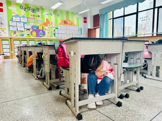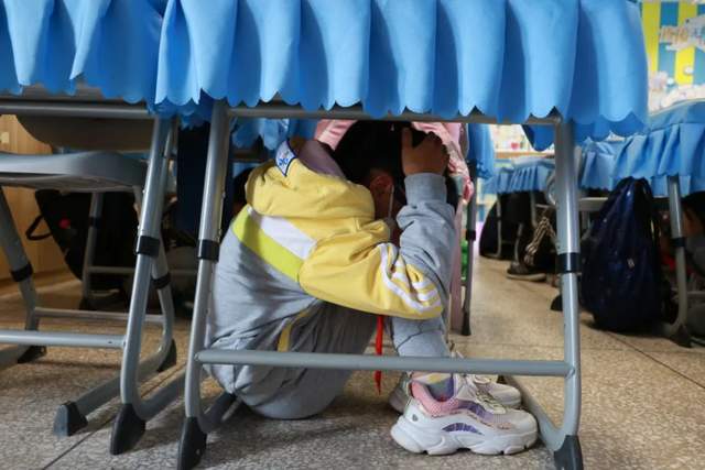 就近避险,安全第一。随着第一声警报响起,防震演练正式开始。班主任立即告知学生“地震”来了,不要慌,并指挥学生迅速双手护头,躲在各自的课桌下,尽量蜷曲身体,降低身体重心,充分利用身边的物品及双手尽可能保护头部,指导学生进行室内避震。