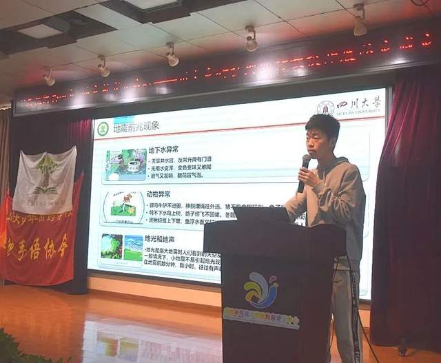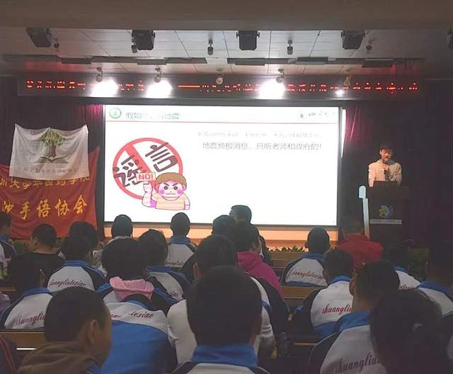 随后,安全处组织学校初中七年级、八年级、九年级和职高一年级、二年级、三年级的同学们在多功能厅参加了由四川大学灾研社开展的以“心灵花园共呵护 防灾教育入我心”为主题的防灾减灾宣讲活动,进一步学习防灾减灾知识,提升紧急避险和自救自护能力。