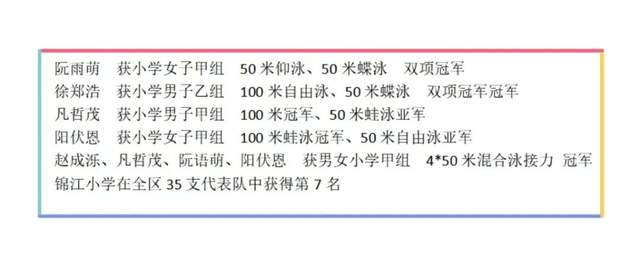 力争上“游”、“泳”者无畏;锦小健儿、光彩闪亮。热烈祝贺锦江小学游泳队运动员在比赛中斩获7金2银、团体第7名的佳绩: