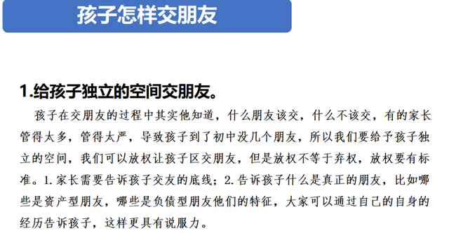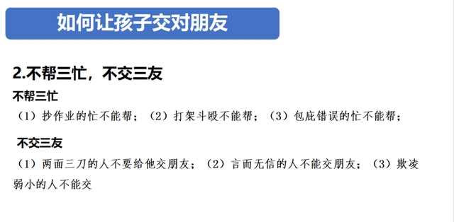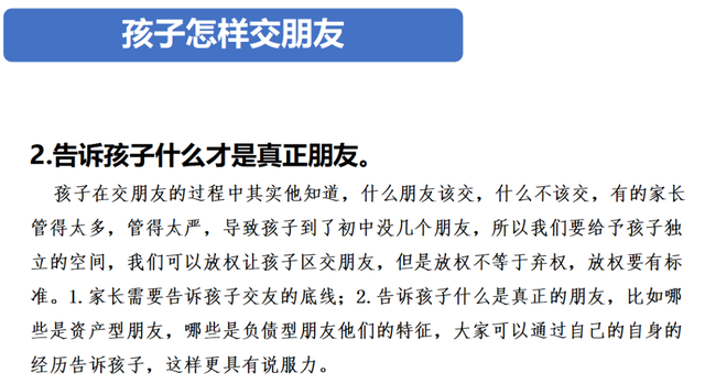 孩子在交朋友的过程中其实他知道,什么朋友该交,什么不该交。有的家长管得太多,管得太严,导致孩子到了初中没几个朋友,所以我们要给予孩子独立的空间,我们可以放权让孩子去交朋友,但是放权不等于弃权,放权要有标准。家长需要告诉孩子交友的底线。告诉孩子什么是真正的朋友,大家可以通过自身的经历告诉孩子,这样更具有说服力。