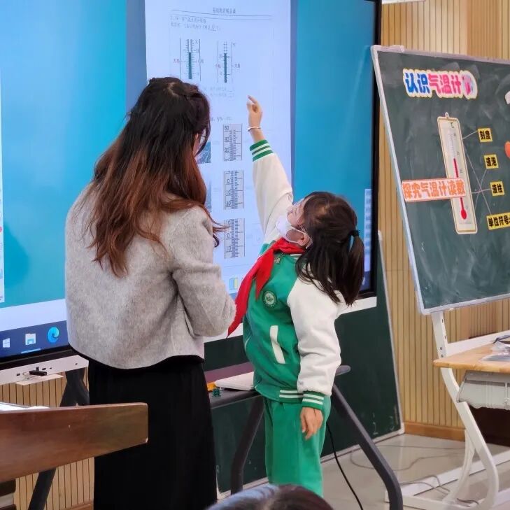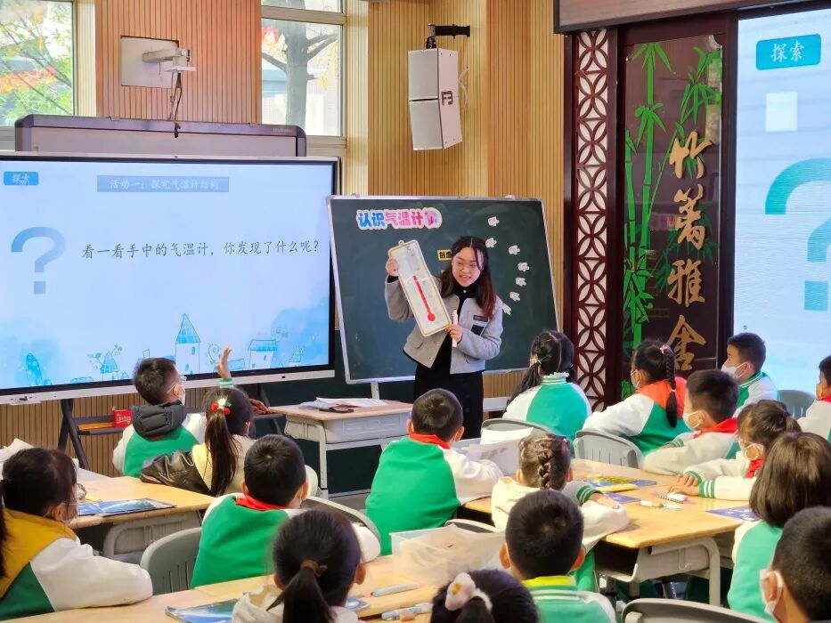 实验小学外国语学校的周辰爽老师带来的《认识气温计》。周老师利用学生对水温计测量水温的认知基础,引导学生思考并尝试设计“一支能测量气温的温度计”。通过任务单的引领,让学生自主观察、自主探究,认识气温计的结构,练习读数、写数,理解“结构与功能要相适应”这一跨学科概念。