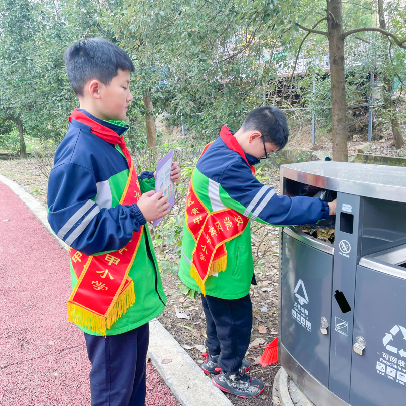 12月14日下午,由黄甲小学教师志愿者带领的黄甲小学各班学生志愿者们走出校园,走进街道和社区对沿途的垃圾进行捡拾、清扫,对收集的垃圾进行分类投放。