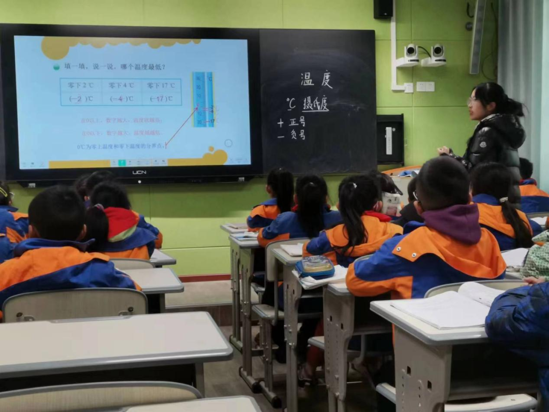 课堂上,彭园园老师先让学生自主探索如何表示北京某天的最高气温(零上温度)和最低气温(零下温度),引导其经历符号化的过程,初步体会数的扩充的必要性,尝试用负数表示零下温度;接着让学生在温度计上标出这些城市的最高气温和最低气温,感受正、负数和0在温度计上的位置,形成直观体验;最后组织学生填一填,说一说,讨论温度背景下负数的大小,达到初步认识“负数”的目的。