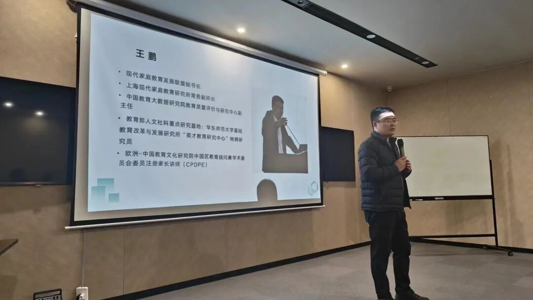 在此次活动的尾声,现代家庭教育发展联盟秘书长王鹏以“学校家庭教育工作该如何做”为题作了专题讲座,他从中国教育的社会背景、时代发展引出当下家庭教育的症结,从而提出使家庭教育落地的系统人才体系搭建,即家庭教育指导能力、家庭教育的讲师、家庭生态辅导师、研究员、家长专业人才库。