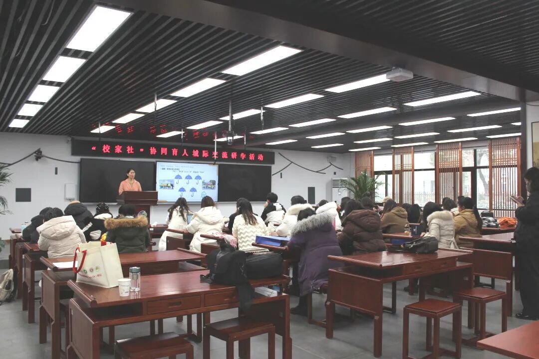 张家港市教师发展中心副主任、苏州市中小学家庭教育名师工作室领衔人徐彩萍首先为大家介绍了幸福家长驿站的运行模式,并通过“社会资本理论”“交叠影响阈理论”“赫耐曼-洛克斯利效应”介绍了校家社协同育人工作“张家港实践”。