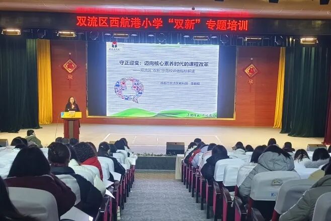 双流区教科院李顺榕副院长以《守正迎变:迈向核心素养时代的课程改革》为主题,从学校与教师在新课程、新教学方面的“何为”和“为何”展开,从理论知识和实际案例两个方面详细讲解了学校强规划、优课程;教师转方式、重行为;课堂教学保实效、高质量三个维度的“双新”工作创新与实践。这是一场有高度、有热度、有力度的专业培训,如同一场及时雨,对我校落实“双新”工作与创新实践具有积极的指导性。