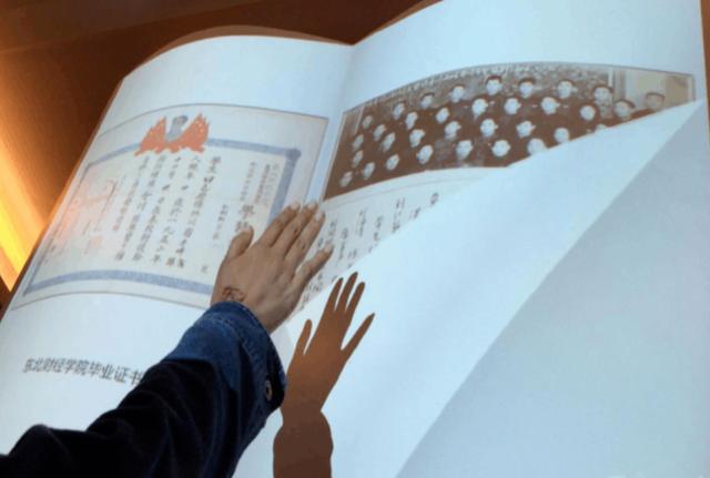 虚拟翻书:在展台放置一本翻开的虚拟图书,参观者做出翻书动作时可实现前后翻页,以假乱真,形式新颖,视觉冲击力强,给人以神奇感,能够引起参观者极大的兴趣,而且可以展示的信息量大。