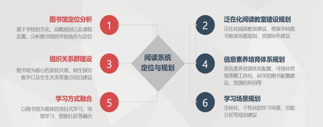 通过学校图书馆建设实际情况的诊断分析之后,再结合学校的文化理念、发展规划以及课程设置,分析图书馆的学校角色与定位,从图书馆服务体系、泛在化阅读体系、图书馆组织关系、信息素养系统、学习场景规划、馆藏优化升级配置等方面统筹规划,促进学校图书馆向阅读型综合场馆的转型。