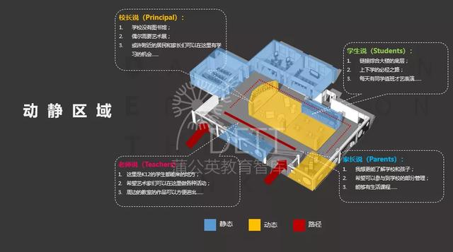 动区:开放阅读区、开放讨论区、小组讨论区、沙龙区、影视鉴赏区、教师发展中心、接待区、动态会议室等。