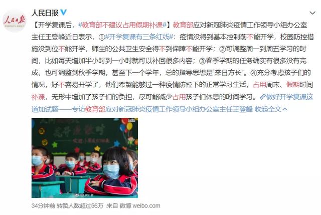 开学以后,我们还是鼓励各地充分利用周一到周五的有效教学时间。如果觉得这个学期的课程落下了一点,可以通过调整一下周一到周五学习的时间,比如每天增加半小时到一小时,就可以补回很多内容。