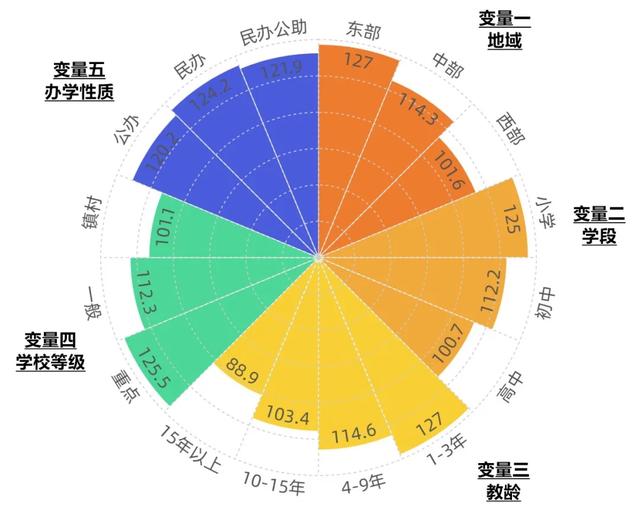 纵观全国,东、中、西部不同区域在诸如态度、支撑和保障、教学过程、效果、需求等各方面的差异是显著的;整体上看,东部的各方面情况要显著优越,中部次之,西部落在最后;但在部分指标上,存在“中部凸显”现象,即中部地区数据显著高于东部和西部地区。
