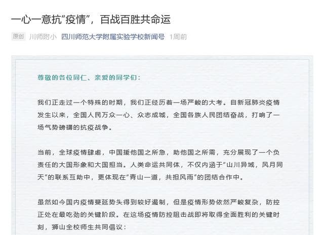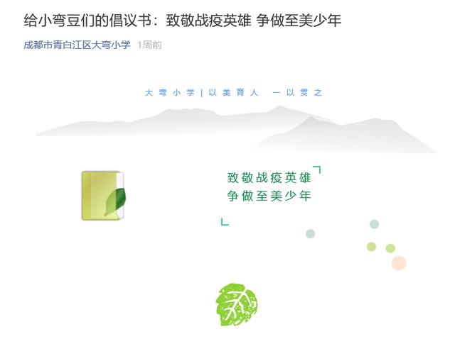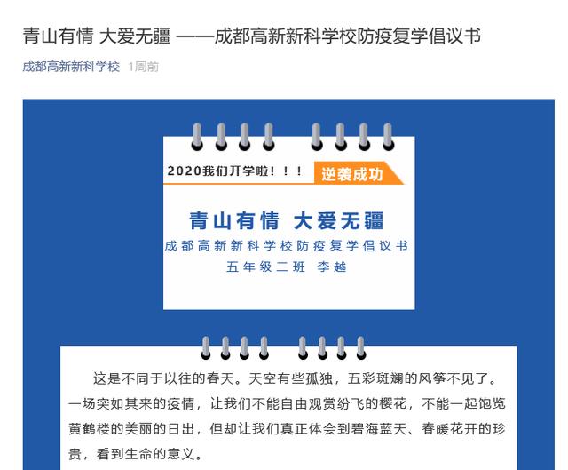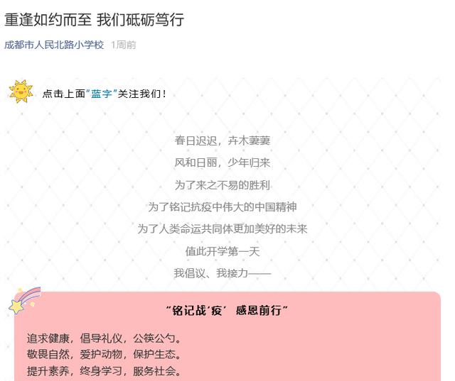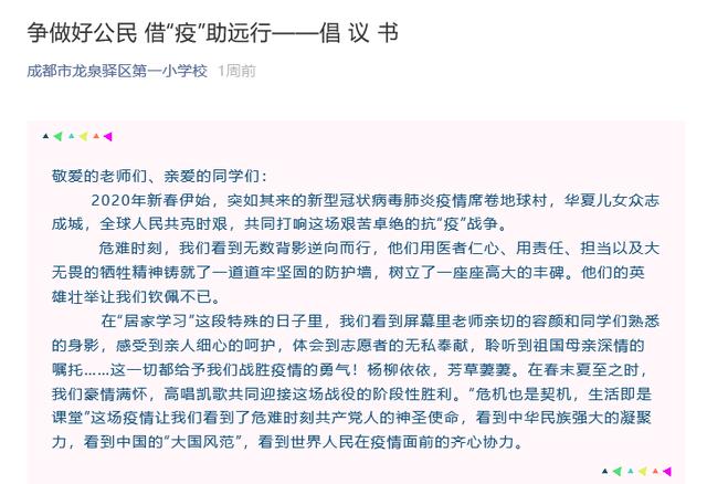 不仅如此,在各个年级分批复学之时,不少学校的师生们还接力发出了以防疫为主题的倡议,倡议学校包括成华小学、四川师范大学附属实验学校、人民北路小学校、大弯小学、龙泉一小、成都高新新科学校、成都七中初中学校、文翁实验中学、石室中学、都江堰市八一聚源高级中学等。而在全市中小学生全面复课之际,同学们更是向各位师长、同学联合发起了“铭记战‘疫’ 感恩前行”的倡议书,号召大家要养成健康的生活学习习惯,更要铭记抗疫斗争中伟大的中国精神。