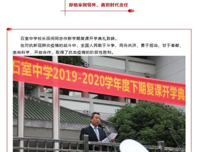 4月20日,石室中学校长田间在新学期复课开学典礼上发起倡议,他希望同学们能够厚植“热爱祖国、感恩人民”的情怀,认识“团结一心、勇担责任”的力量,明白“命运共同、合作共赢”的必需,知晓“敬畏自然、智慧理性”的重要,实现“见贤思齐、勇担责任”的成长。
