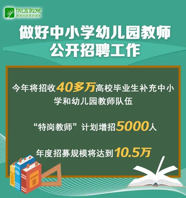 党中央、国务院高度重视高校毕业生就业,教育部全力抓好稳就业、促就业工作,启动2020届普通高校毕业生就业“百日冲刺”行动。今年将招收40多万高校毕业生补充中小学和幼儿园教师队伍;“特岗教师”计划增招5000人,年度招募规模将达到10.5万。为做好中小学幼儿园教师公开招聘工作,通知从挖潜创新、重点突破、优化供给、大力扶持等八方面释放政策红利。