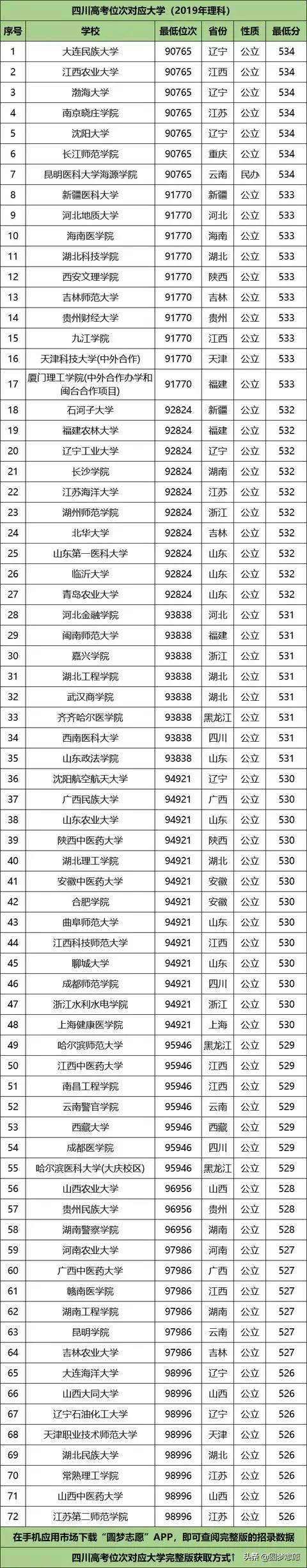 根据国内各个高校在四川省理科的招录数据可知,2019年四川省高考成绩在9万名~10万名之间的理科生能上的学校有72所,对应的分数为526分~534分。