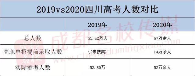 2020年,四川省高考报名人数为67万余人,总参考人数较上年增加2万人。