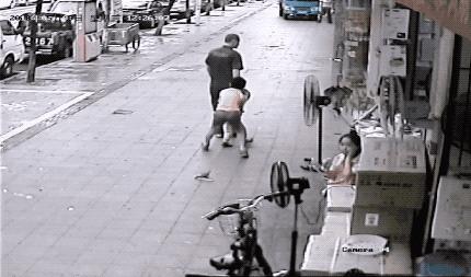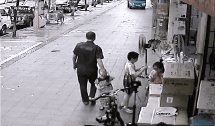 之前,在广东东莞一家电器店外,一黑衣男子试图拉走一名幼儿。男子手法看起来相当娴熟,先是摸小孩下巴,接着拉住孩子手臂向前拖拽。
