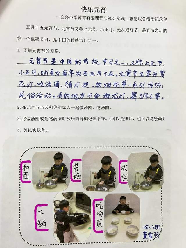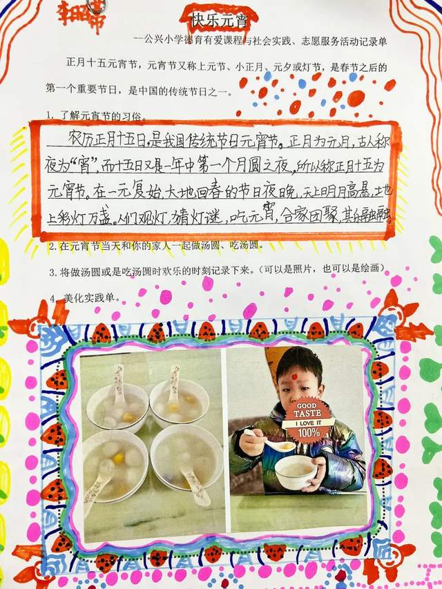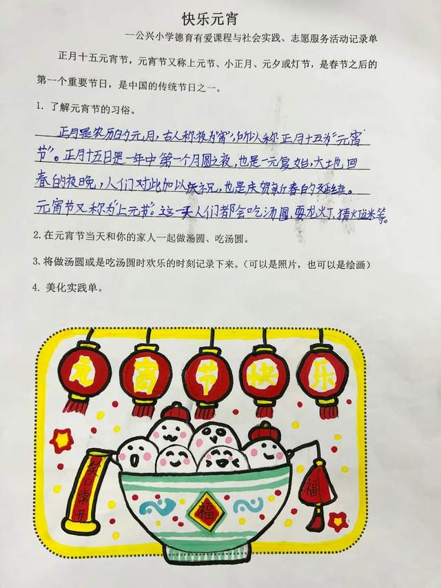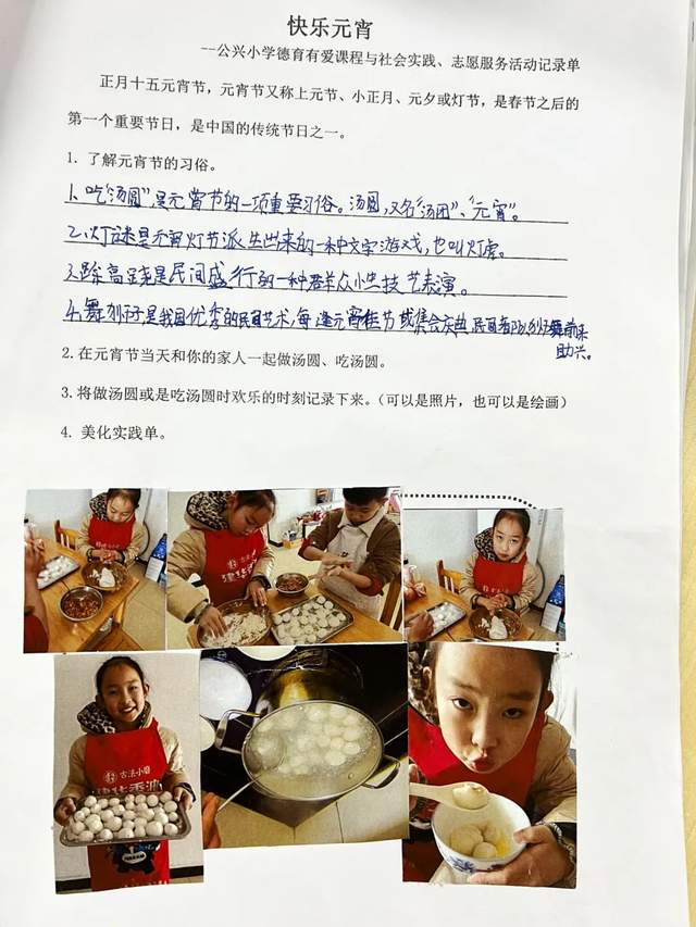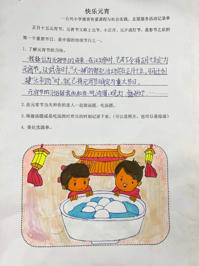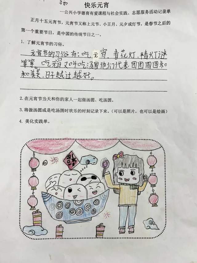 为了拓展队员们对民俗文化的了解,每个队员动手查阅元宵节的来历和习俗,在元宵节和家人一起做汤圆、赏元宵并将欢乐时刻记录下来。