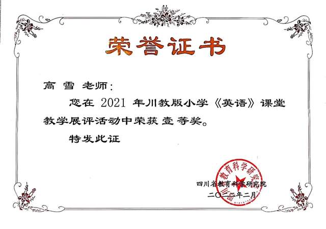 取得优异的成绩背后离不开高雪老师在专业发展道路上的努力钻研,更离不开双流区教育科学研究院小学英语教研员尚梅林老师的悉心指导。
