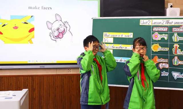 课堂中,教师通过绘本学习,欣赏四季变换的视频,学生有节奏、有感情地跟读并朗诵本课小诗 Seasons and Weather,由此感受大自然之美,热爱大自然、热爱生活。