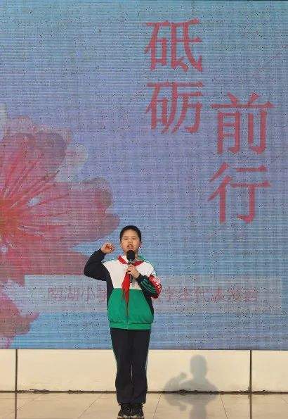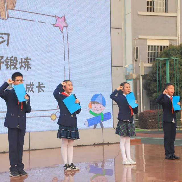四年级的同学们在“为什么读书?”的深思中寻找着自己前行的道路,学生代表掷地有声的发言点燃了全体同学的斗志!春日载阳,东风骀荡,在飘扬的五星红旗下,同学们声声誓词,响彻云霄:好好学习 好好锻炼 快乐成长!