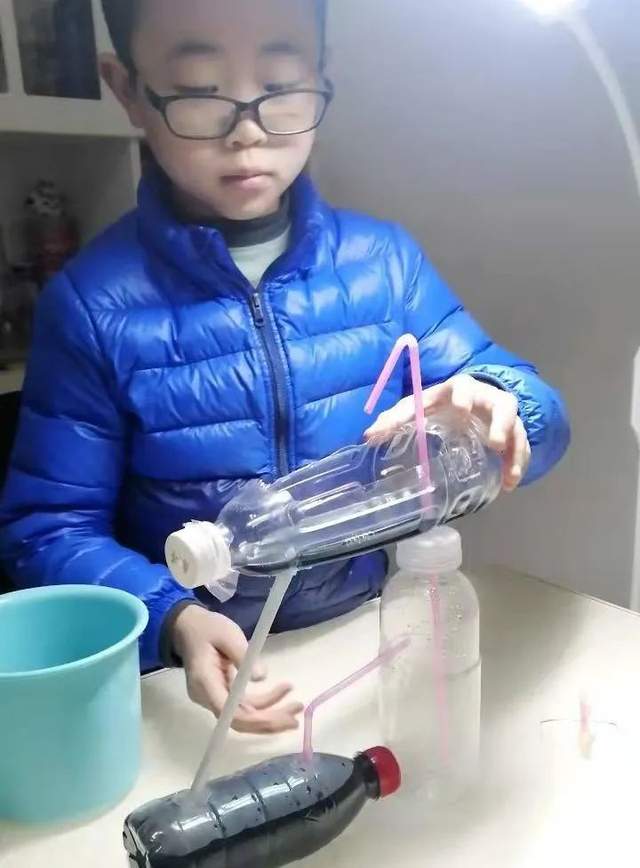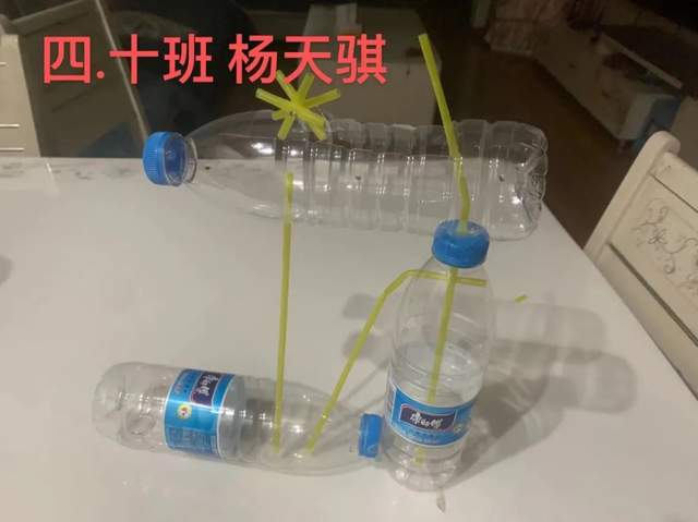 实验材料:三个透明塑料瓶、一次性吸管、有色液体(可以在清水中加入色素)、剪刀、热熔胶。