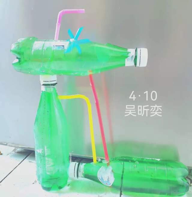 实验步骤:准备两个塑料瓶子,用热熔胶粘在一起,在瓶盖上打个孔,插一根吸管,吸管离瓶底0.5厘米,用热熔胶固定吸管,堵住缝隙,准备第三个塑料瓶子,开一个长方形口,在长方形两端对应底部开孔,瓶底的孔穿过这根吸管,用热熔胶固定瓶子和吸管,在这两个位置开孔,用吸管连接,再用热熔胶堵住周围缝隙,这里再开个孔,用吸管从上到下连接,下面吸管接近瓶子,上面吸管露出一点,用吸管做一个小水车,修剪一下,穿根细铁丝,固定在瓶子上,然后开始在上面瓶子里加水,水就会全部流入下面的瓶子,倒过来,让水流进另一个瓶子,再把瓶子摆正,再从上面倒水,小水车就会转起来。
