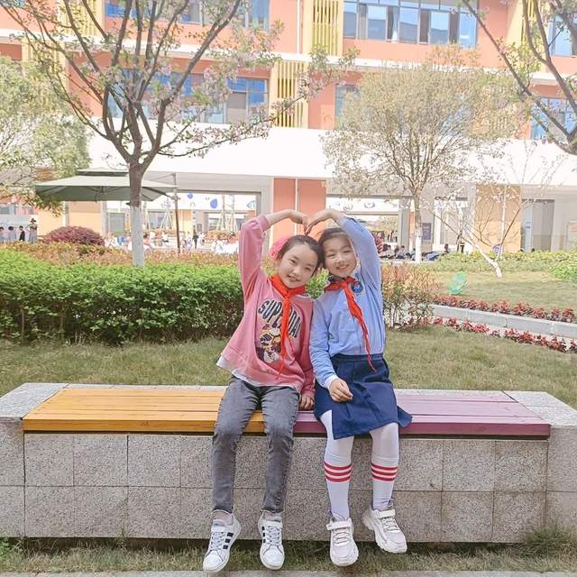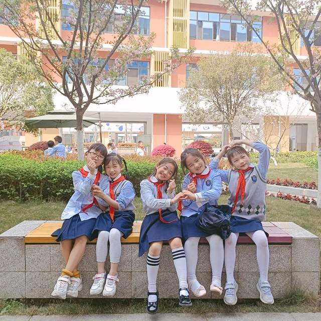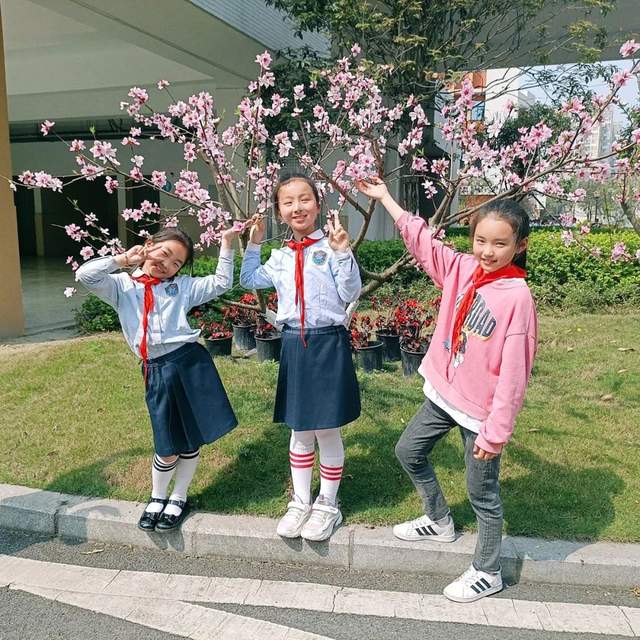 三年级的哥哥姐姐们漫步在粉花蓝天如画一般的校园,处处弥漫着爽朗的笑声,留下的是一个个活泼快乐的身影。