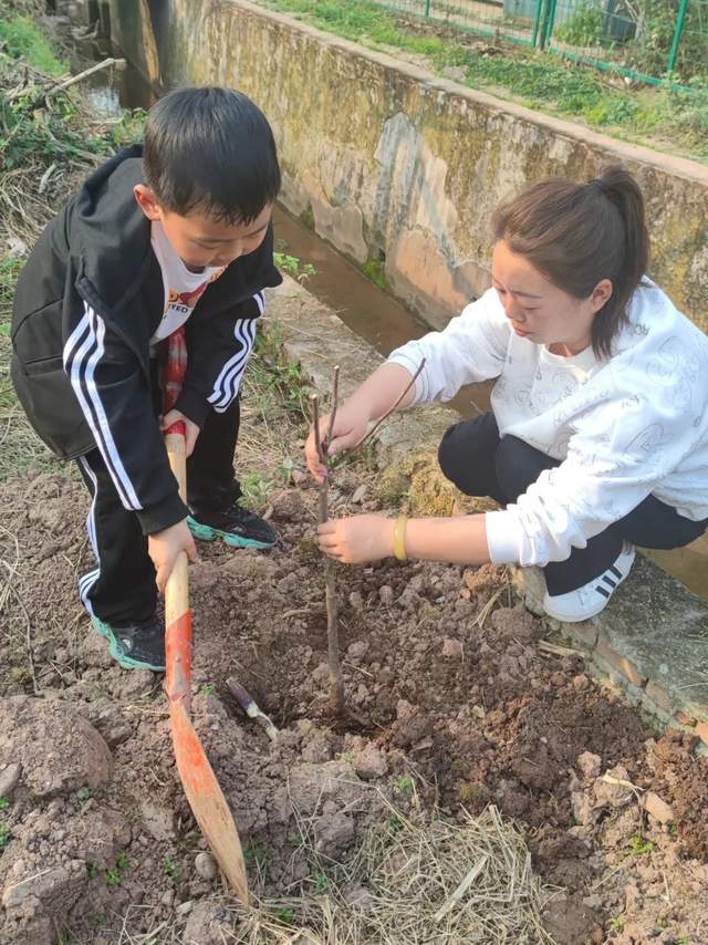 在妈妈的带领下来到屋后沟渠边,妈妈扶正小树苗,孩子挥锹填土,好一幅温馨的“亲子植绿图”。