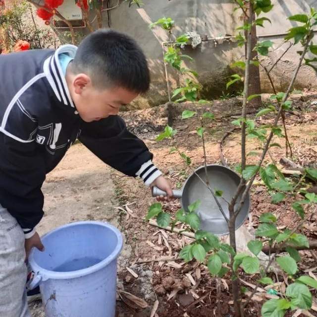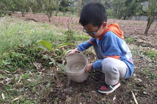还有的孩子和妹妹一起去为两年前植下的柚子树除草、施肥。“树苗同我一起长高啦!”孩子惊奇地喊道。
