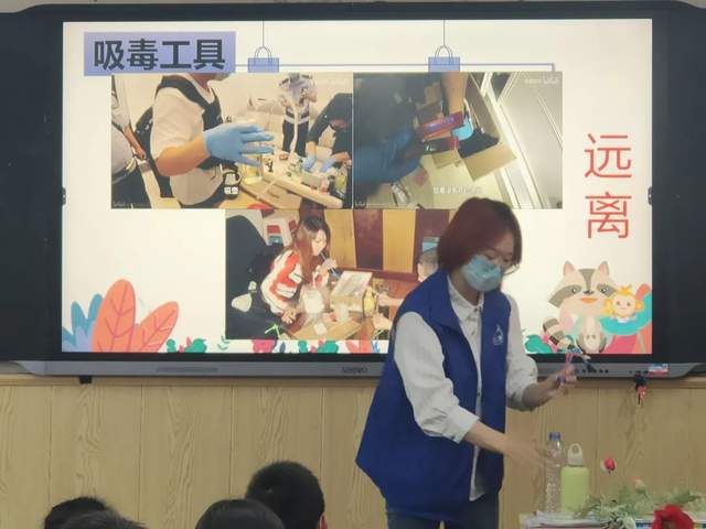 课堂上,社区工作人员通过直观的PPT展示、播放禁毒宣传片、展示仿真毒品等方式,向师生们重点讲解毒品的概念、毒品的危害性、新型毒品预防措施等知识。宣传人员采取一问一答、有奖问答的互动方式,让同学们在轻松愉快的氛围中了解毒品知识,提高防范意识。
