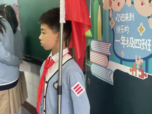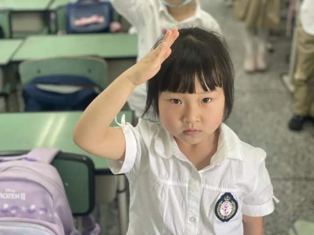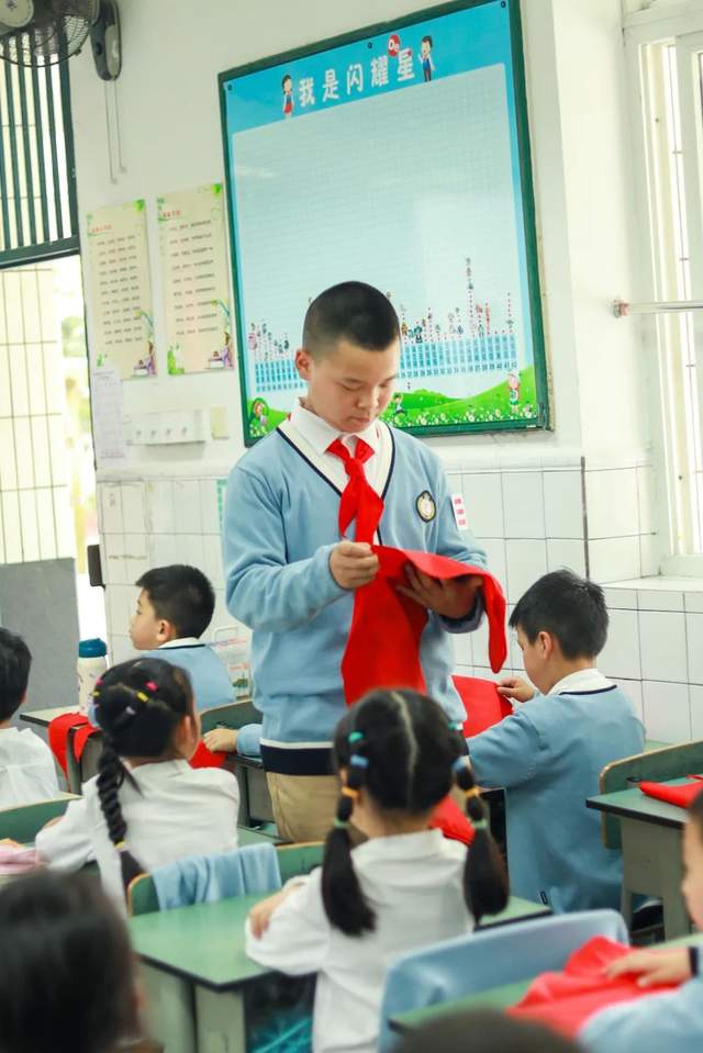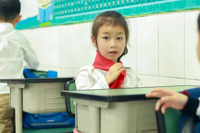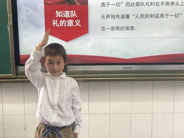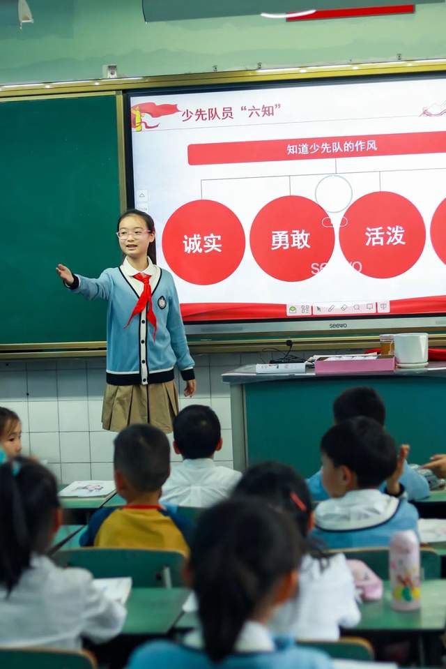 打开课件、面向同学,“红领巾小辅导员”们精神抖擞、自信十足,俨然变成了一位位“小老师”。“小老师”教得认真,一年级同学们学得也认真。当自己尝试着佩戴好红领巾时,一张张可爱的小脸上都露出了开心、灿烂的笑容。接着,萌娃们又学习了呼号、宣誓、唱队歌等队知识,他们脸上的表情认真而严肃,高举的右拳代表着他们加入少先队的决心。