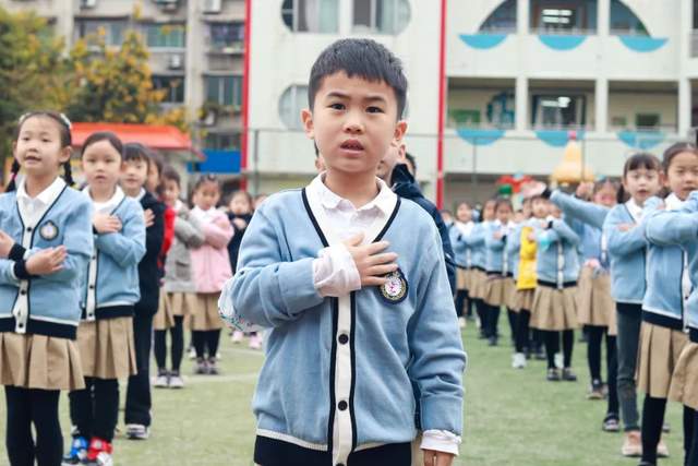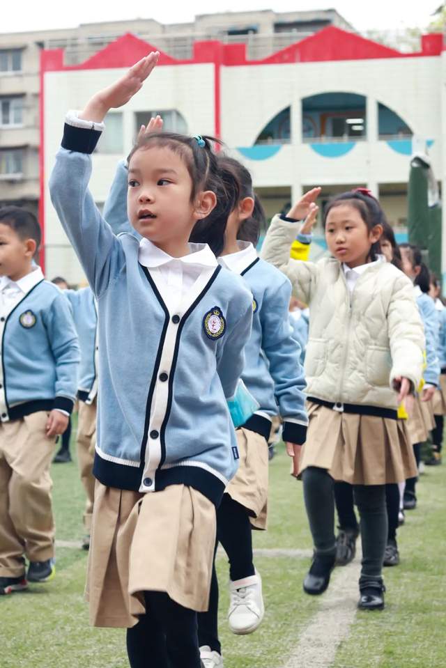 快看!一年级的萌娃们整齐的站在操场上,嘹亮的歌声回荡在空中。