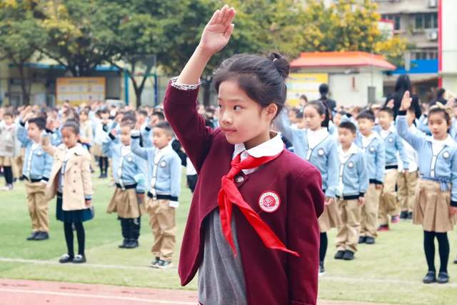 同学们在大队辅导员杨心怡老师的带领下伴着歌声和舞蹈,逐条温习和逐项训练,让他们在学习和实操中不断感受到能够成为一名少先队员的光荣感和加入少先队组织的归属感。在杨老师的帮助下,他们对队歌歌词的理解不断深入,对节奏和音调的把握逐渐熟练,歌声响彻整个操场,传遍校园,爱国主义的种子也悄然在他们心中生根发芽。