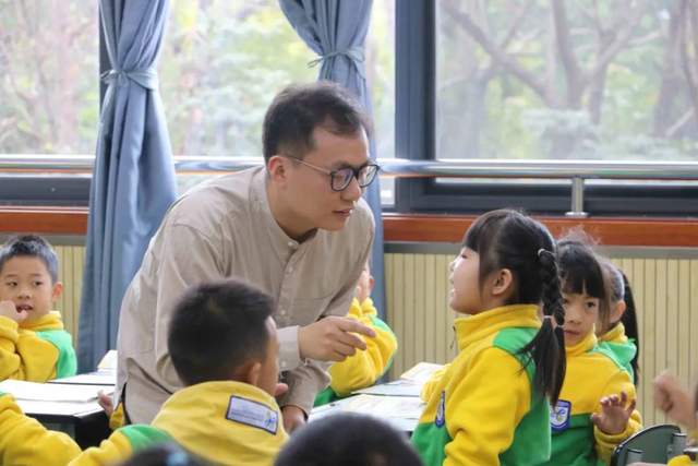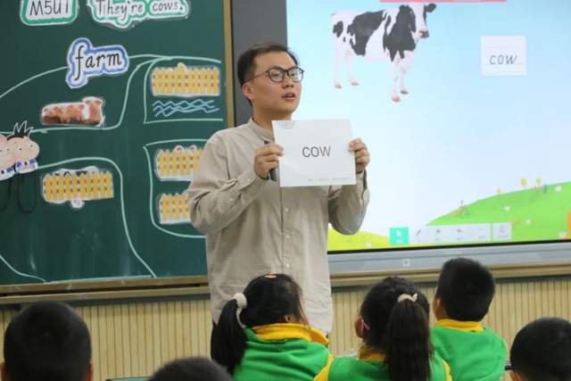 随后,一年级的王嘉诚老师和1.6班的孩子们为大家带来的是一年级下册《M5U1 They’re cows.》精彩展示。王老师以手指变动物操导入本节课的主题,激发孩子们的学习兴趣,并引入本节课发生的地点:农场。接着,王老师以动物的声音,动物的玩偶引入本节课的生词:pig, cow, duck, chicken, egg。采用run the train,hit and say,high and low voice等进行单词的操练。随着课文的推进,孩子们跟着本课的主人公Sam和Daming一起开始了农场大冒险。课文结束以一首节奏感十足的chant,和益智游戏复习之前和本课所学的动物。整堂课王老师引导孩子们跟随小主人公的脚步,来体验农场的生活,层层推进,步步落实,深刻地体现了教学评一致性。