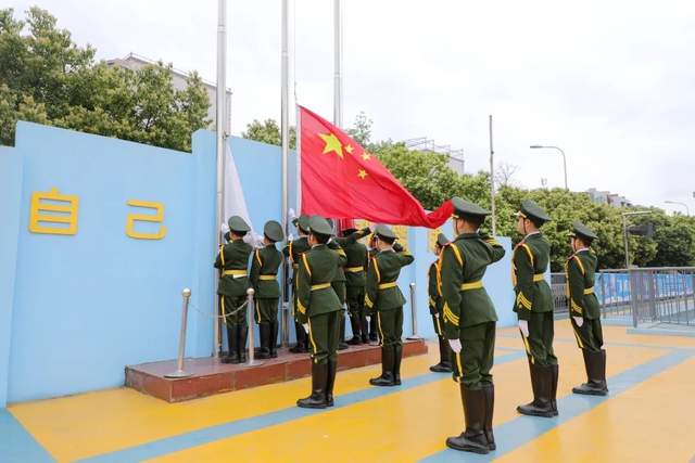 随着《中国人民解放军进行曲》缓缓响起,棠园国旗护卫队员们喊着响亮的口号、迈着整齐的步伐,前进、变队、升旗,威武雄豪。