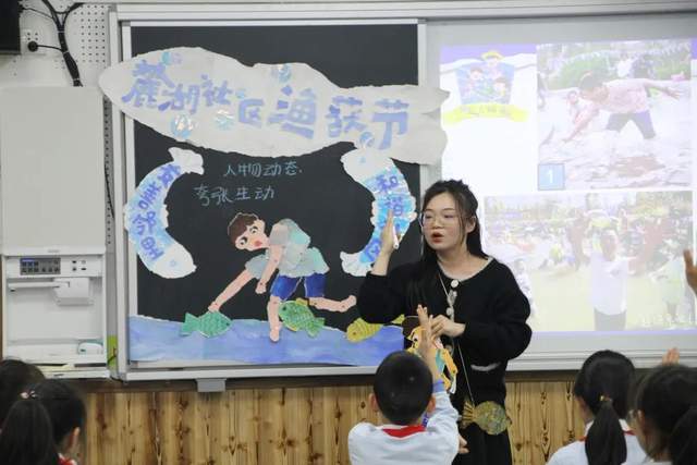 接下来,成都文峰名师工作室吉薇羲带领天府新区麓湖小学美术团队精彩亮相,麓湖小学青年老师汪湉给大家展示了《麓湖渔获节》校本课程。该课为人美版三年级下册《我们的社区》的拓展课,意在通过社区的活动关注人与人之间的联系,展现友善的邻里关系,营造和谐社区环境,共建共享公园社区,最终实现公园城市的美好目标。课中,汪老师通过观看视频、图片让学生感受到友善邻里、和谐社区的含义;通过有趣的活动,发现人物动态的生动性、丰富性;通过欣赏艺术作品,了解非遗文化;通过微课展示撕纸画进行技法教学。