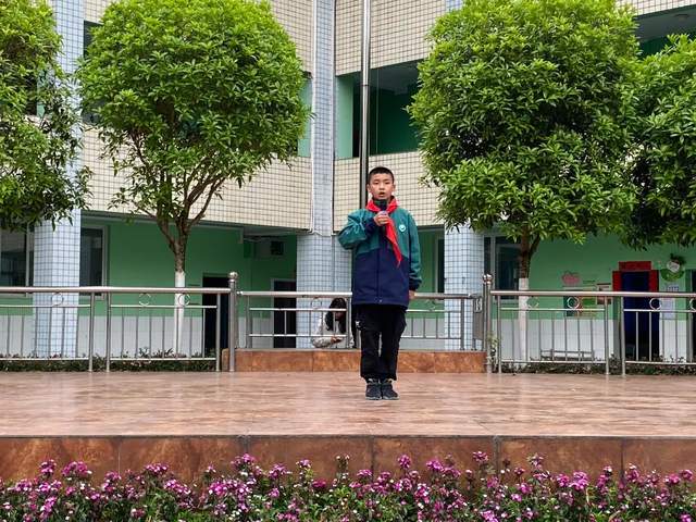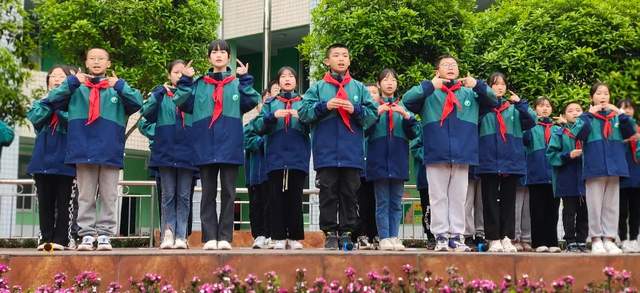 国旗下展示的是六四中队,四名队员带来了诗朗诵《生命之源——水》,用富有感染力的声音传递水的重要性,并倡议同学们珍惜每一滴水,争做惜水如金的环保小公民。接着,全体队员带来了“节约用水”手势舞,以整齐、活泼的表演表达节水的重要性。