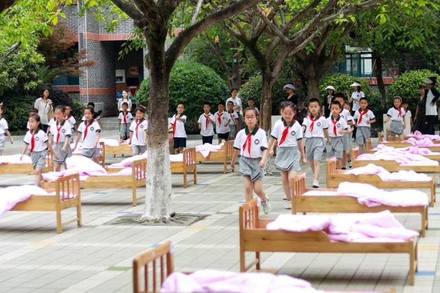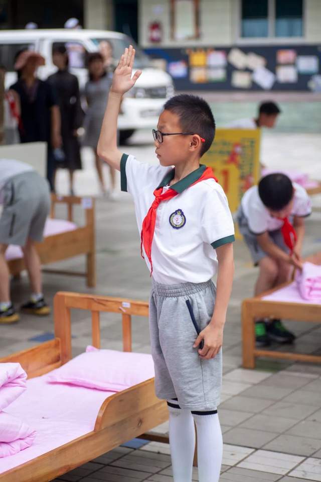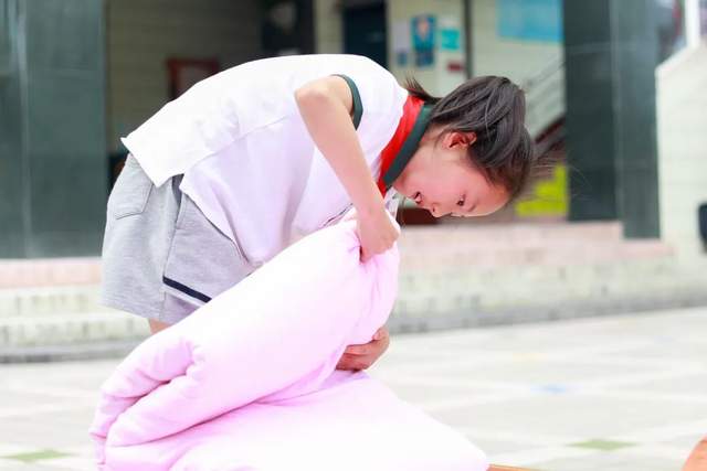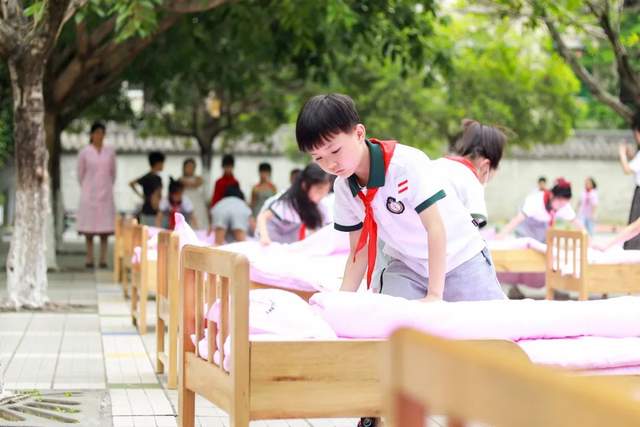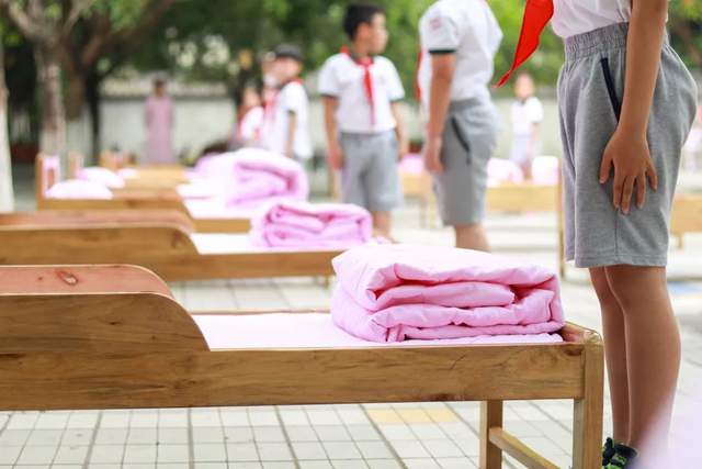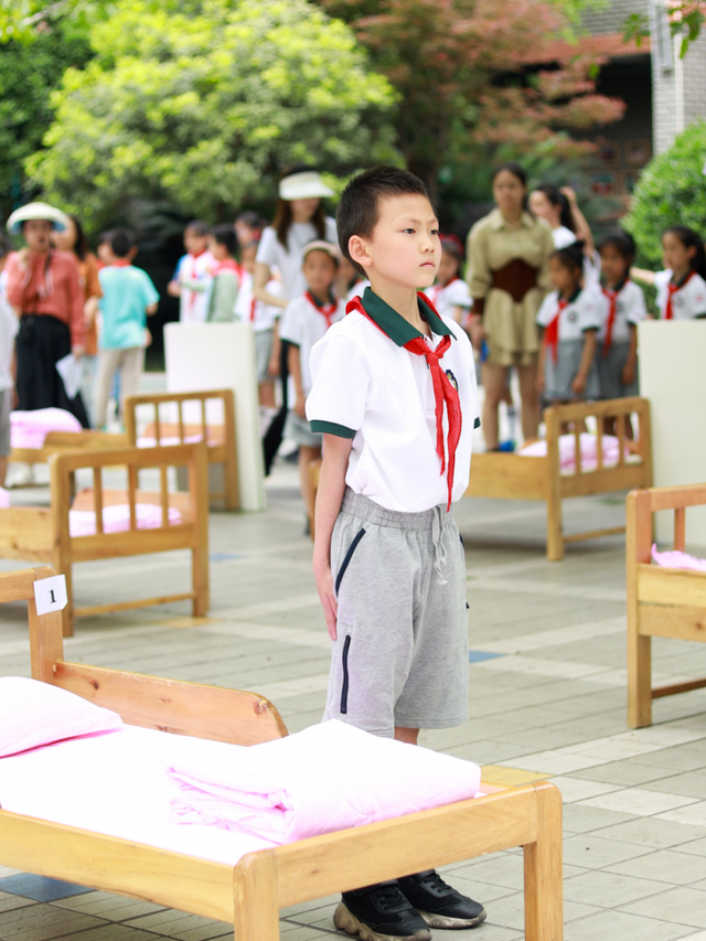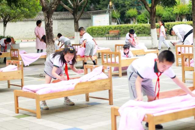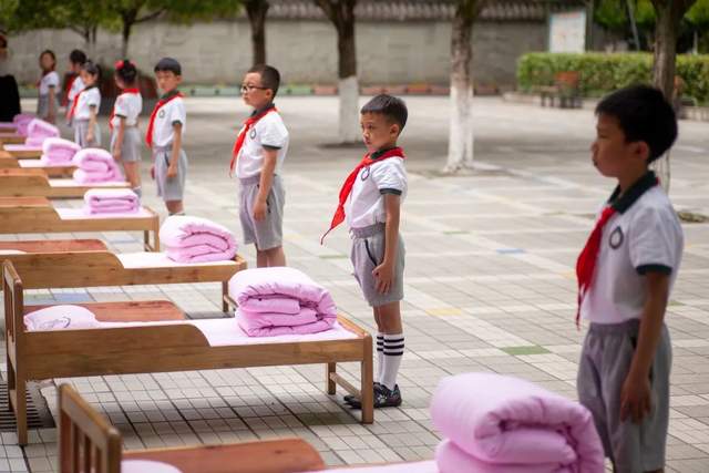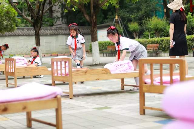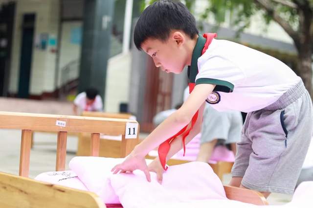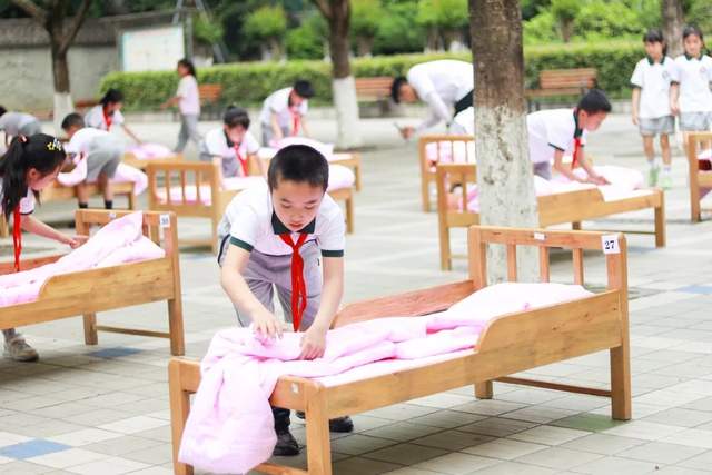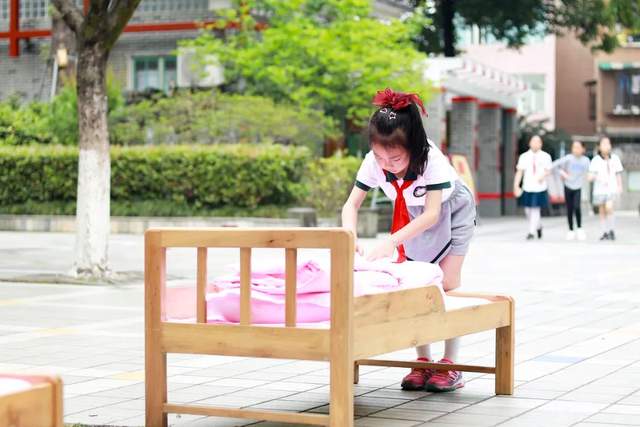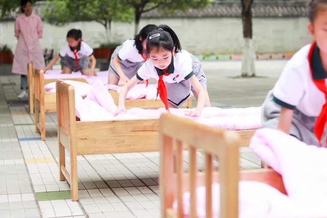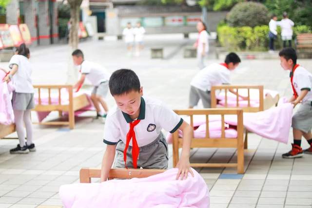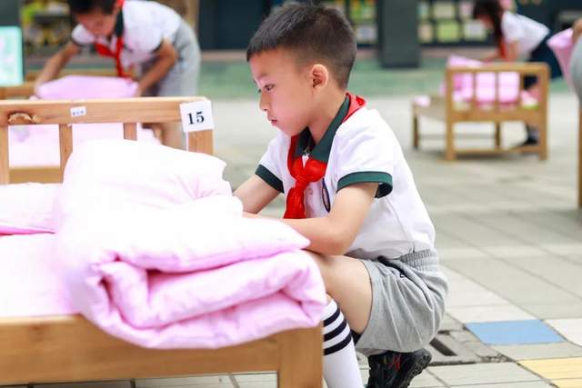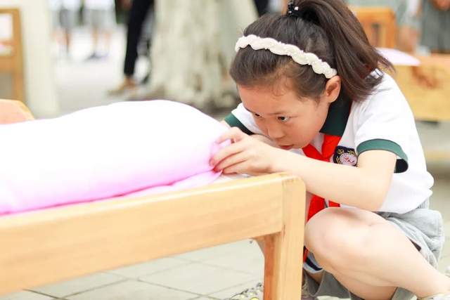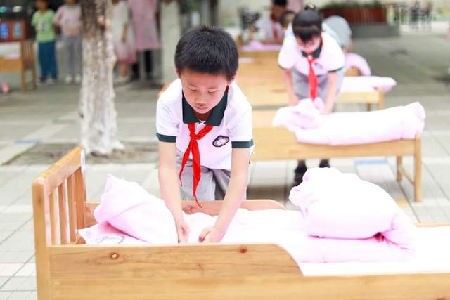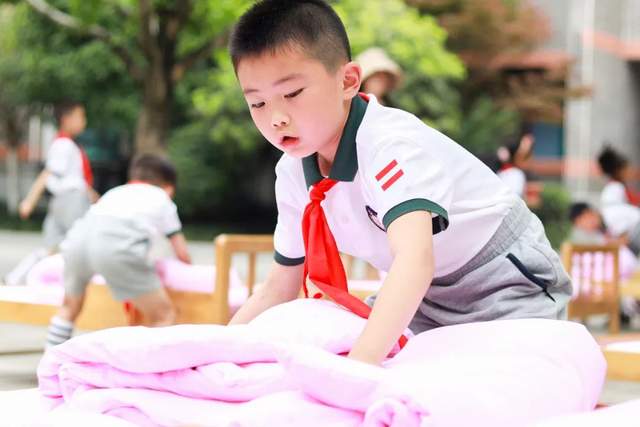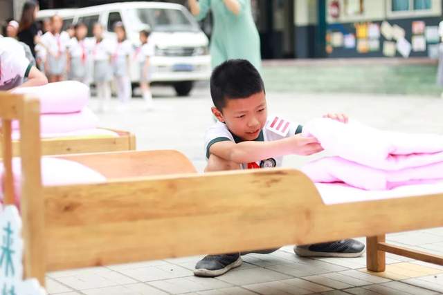 “咦,操场上怎么有那么多张床?”“还有好多同学在叠被子呢?”“真好玩,我们一起去看看吧!”几个孩子牵着小手蹦着跳着围了过来。原来,操场上正在进行的是二年级的叠被子比赛呀!只见孩子们动作迅速,小手灵活,眼睛随着小手不停地上下左右转动,不一会儿,原本杂乱的被子在和孩子们手中就成了初具形态的小豆腐;眼看时间还未到,追求完美的孩子们孩子争分夺秒,一边瞄准,一边精修,转眼间,操场上陆续出现了许多四四方方的豆腐块。
