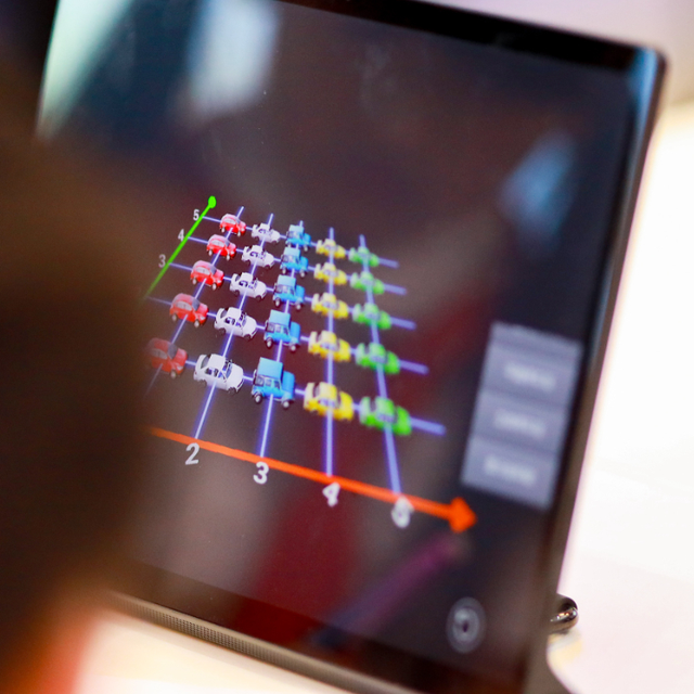 小学生在建立立体感、空间感上是比较困难的,立体的图形放在平面中就会比较抽象难懂,老师往往缺乏必要的工具来教学。董晓睿老师的数学课《确定位置》,别开生面,恍如电影《汽车总动员》的场景在教室活灵活现。AR技术建造了逼真的直线停车场、平面停车场和立体停车场。这堂AR数学课,由直线到平面再到立体,使孩子逐步构建空间感,体会线动成面、面动成体的思维过程。后续孩子们利用平板分组合作,根据车子用数对确定位置,再根据数对来确定汽车的位置,完美实现了教学目标。