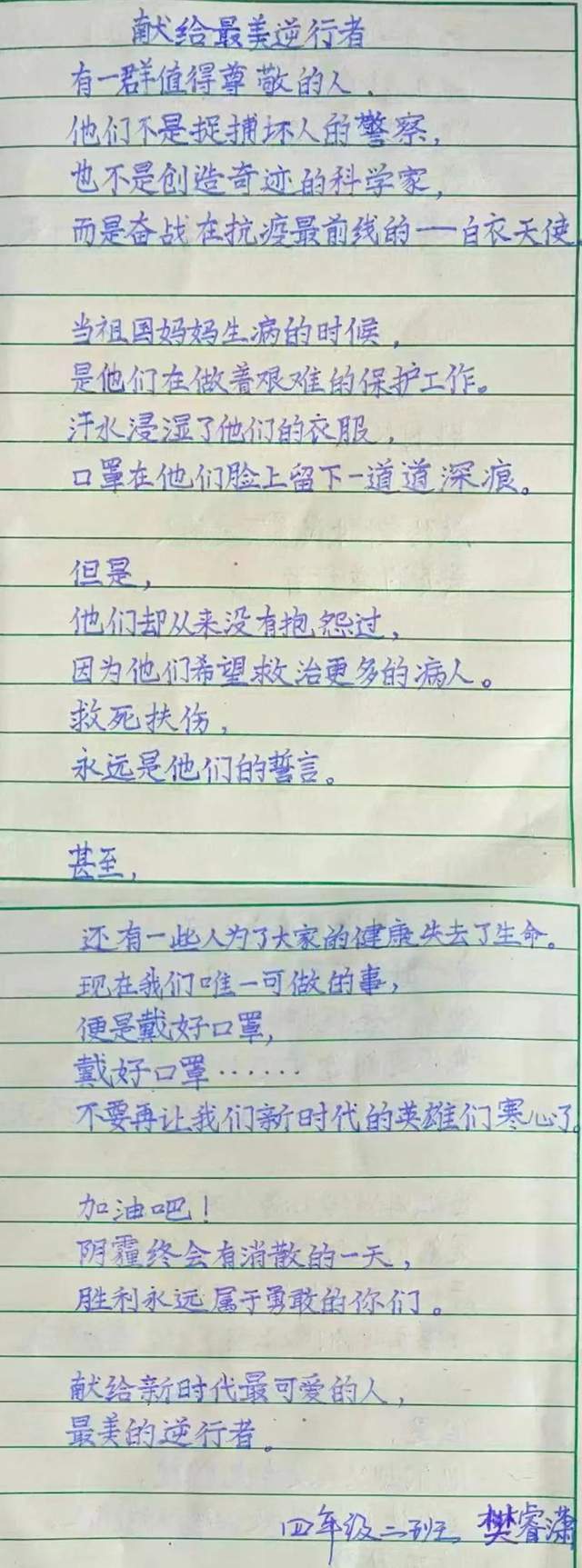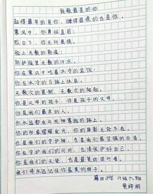 这一切的胜利都离不开奋战在一线的防疫工作者们,正是有了他们的挺身而出,才换来了今日的胜利成果。面对默默奉献的防疫工作者们,籍小学子心怀感恩用实际行动言说心中的感谢!
