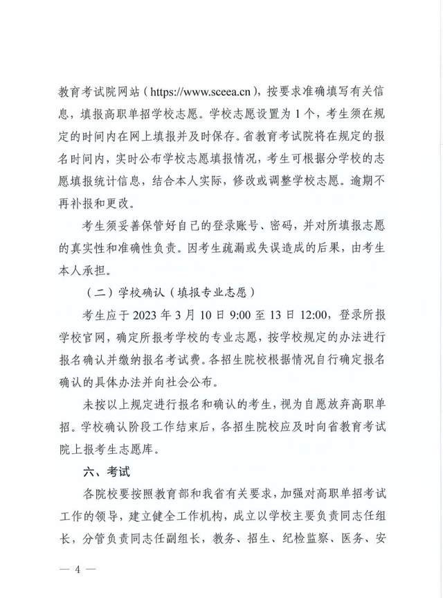 考生应于2023年3月1日9:00至7日12:00,登录四川省教育考试院网站(http://www.sceea.cn),按要求准确填写有关信息,填报高职单招学校志愿。学校志愿设置为1个,考生须在规定的时间内在网上填报并及时保存。省教育考试院将在规定的报名时间内,实时公布学校志愿填报情况,考生可根据学校的志愿填报统计信息,结合本人实际,修改或调整学校志愿,逾期不再补报和更改。