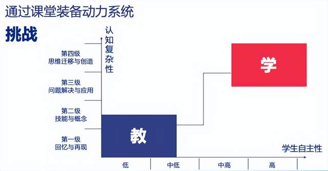 动力系统还要有挑战,从最低阶的回忆与再现,到最高阶的思维迁移与创造。如果都在老师教的层面,学的东西全靠记忆,学生的自主性就很低。认知所需的思维含量和能力层级越高,学生的自主性才越强,才最能激发学生的动力系统。