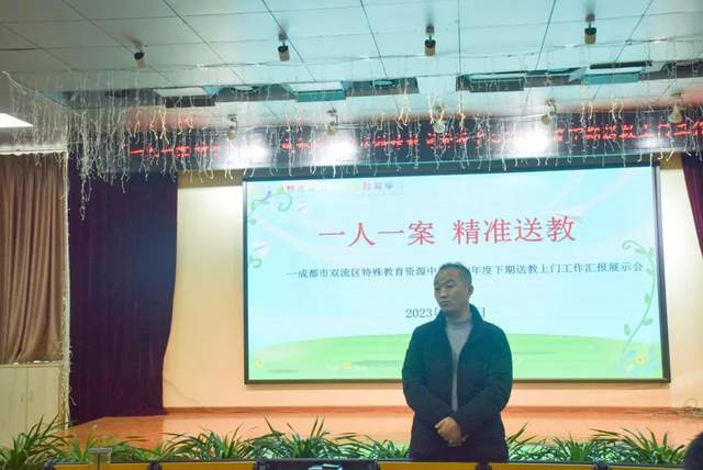成都市双流区特殊教育资源中心执行主任王双亭讲话,王主任被送教小组老师们的专业送教以及对孩子们毫无保留的爱所深深感动,他强调老师们一定要不断精进专业,精准送教,让每一名残疾儿童少年享有公平而有质量的教育。
