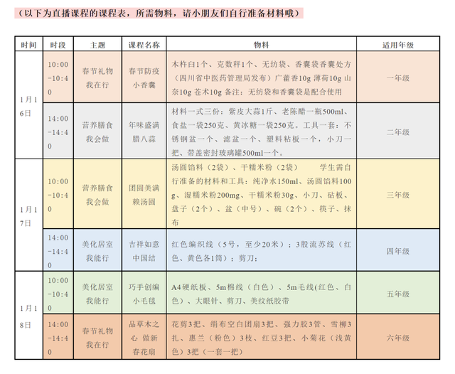 课程主要围绕“整洁居室我能行”“营养膳食我会做”“春节礼物我在行”“志愿服务我争先”等主题,为小学生提供春节文化习俗实践直播课程和春节主题创意劳动实践录播课程,所有课程免费使用,可选择参与,需提前准备。